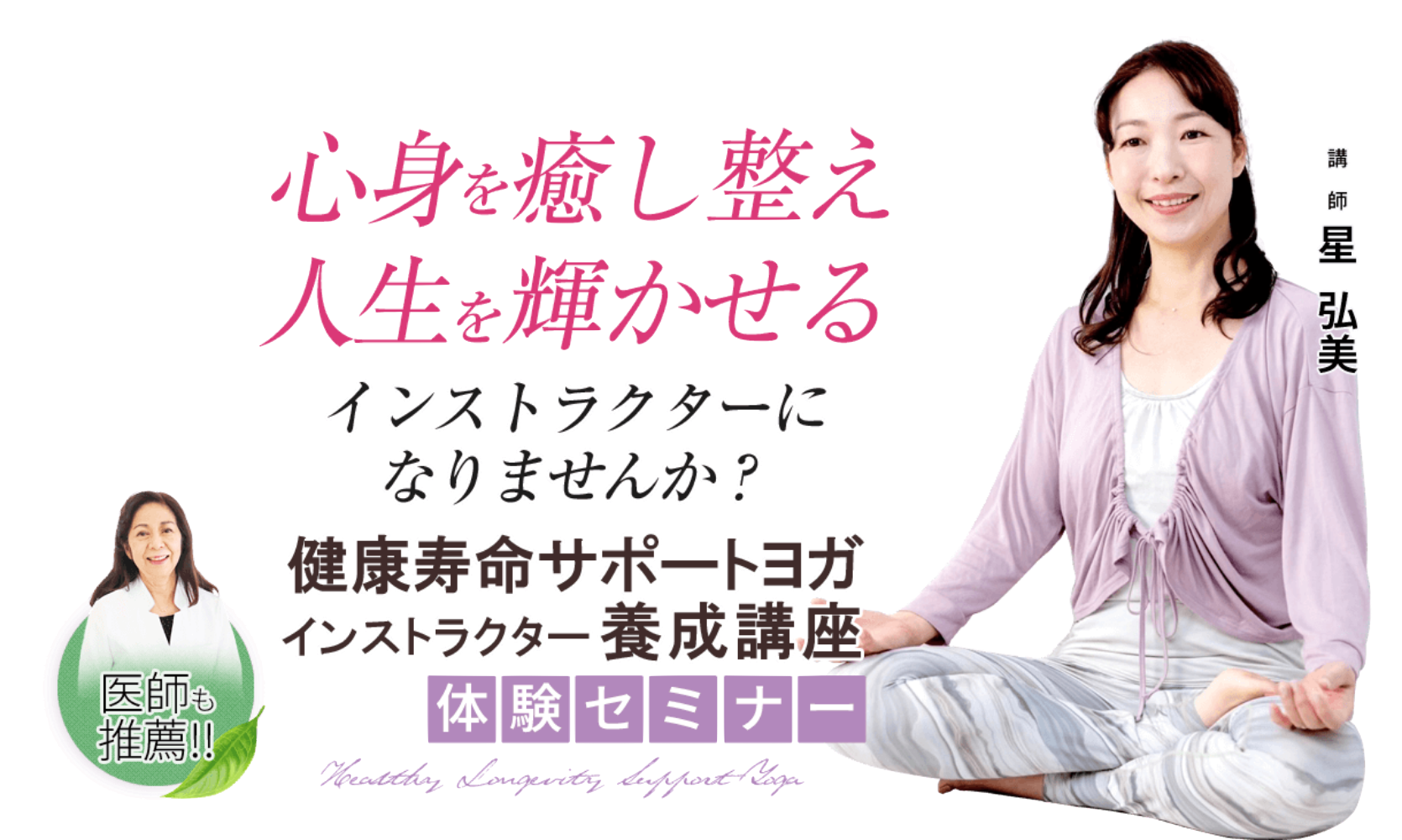 | セミナー内容 | ● 「健康寿命サポートヨガ」体験レッスン レッスン1)最初のカウンセリング レッスン2)心身とも整う「呼吸法」 レッスン3)転倒防止にも役立つ「体のほぐし」 レッスン4)健康で美しい体づくりに役立つ「ヨガポーズ」 レッスン5)心身を癒す「リラクゼーション」 レッスン6)最後のカウンセリング ● 『健康寿命サポートヨガインストラクター養成講座』のご案内 |