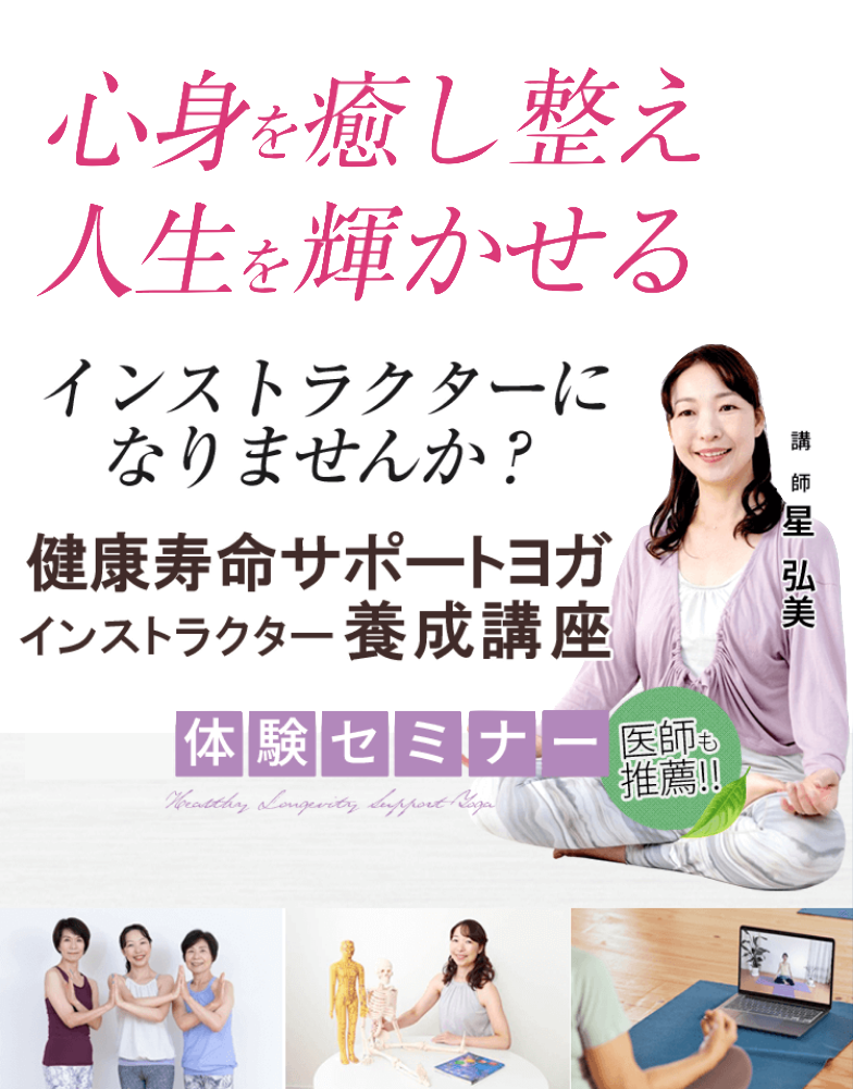 この講座は、私が今までに取得した25以上ものヨガや健康関連の資格や、今までたくさん学び研鑽してきた中から、健康寿命を伸ばし豊かで楽しい人生を送るための要素を集めた、いわば星弘美の集大成のプログラムです。
